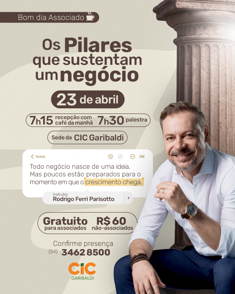 A Câmara de Indústria e Comércio de Garibaldi vai receber, no Bom Dia Associado de 23 de abril, o consultor estratégico Rodrigo Ferri Parisotto, que apresentará a palestra “Os pilares que sustentam um negócio”, abordando desafios comuns enfrentados por empresas em fase de crescimento.