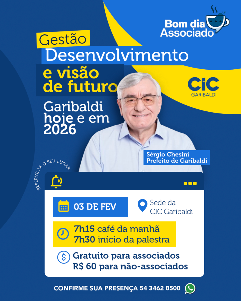 A CIC Garibaldi realiza, no dia 3 de fevereiro, a primeira edição de 2026 do Bom Dia Associado CIC, reunindo associados, colaboradores de empresas filiadas, gestores e lideranças para um café da manhã seguido de palestra, na sede da entidade.