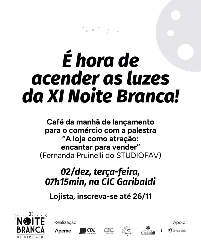 A magia da XI Noite Branca de Garibaldi começa antes mesmo de as luzes se acenderem. No dia 2 de dezembro, a CIC Garibaldi recebe o Café da Manhã de Lançamento do evento, a partir das 7h15min, marcando o início das atividades que irão preparar o comércio local para uma das noites mais aguardadas do ano.