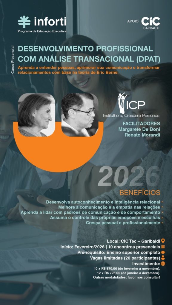 A CIC Garibaldi, em parceria com a Inforti, abriu as inscrições para o Programa de Desenvolvimento Profissional com Análise Transacional (DPAT), entre fevereiro e novembro de 2026, em um total de dez encontros (manhã e tarde).