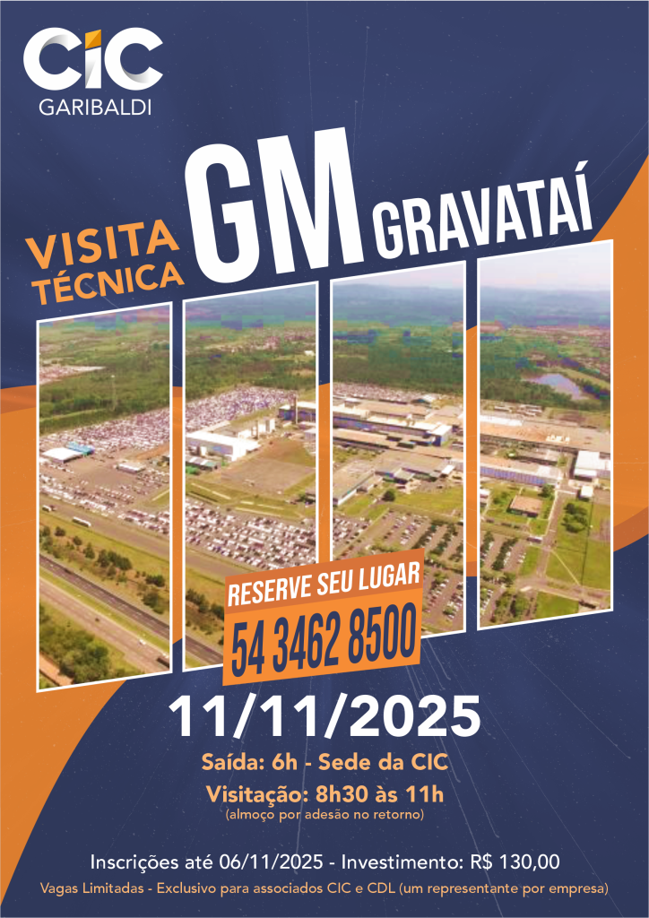 Após o interesse expressivo na primeira edição, cujas vagas foram esgotadas rapidamente, a CIC Garibaldi confirmou para o dia 11 de novembro, a realização de uma nova visita técnica à fábrica da GM em Gravataí. A ação busca proporcionar aos associados uma experiência prática de imersão em um dos mais modernos complexos industriais do setor automotivo no país.