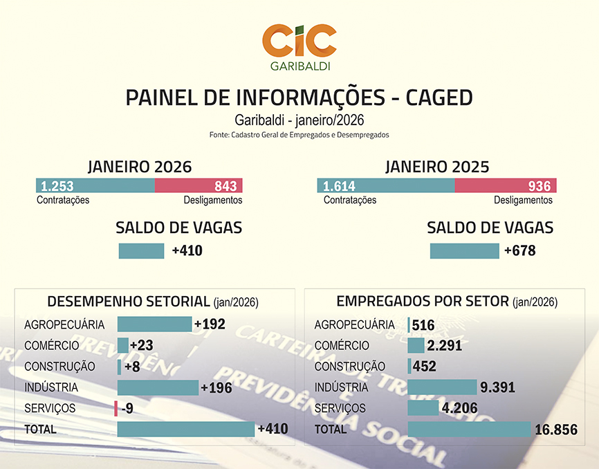 Garibaldi criou 410 novos empregos com carteira assinada em janeiro de 2026. Foram 1.253 admissões ante 843 desligamentos. O número é 39,5% inferior se comparado ao mesmo período do ano passado.