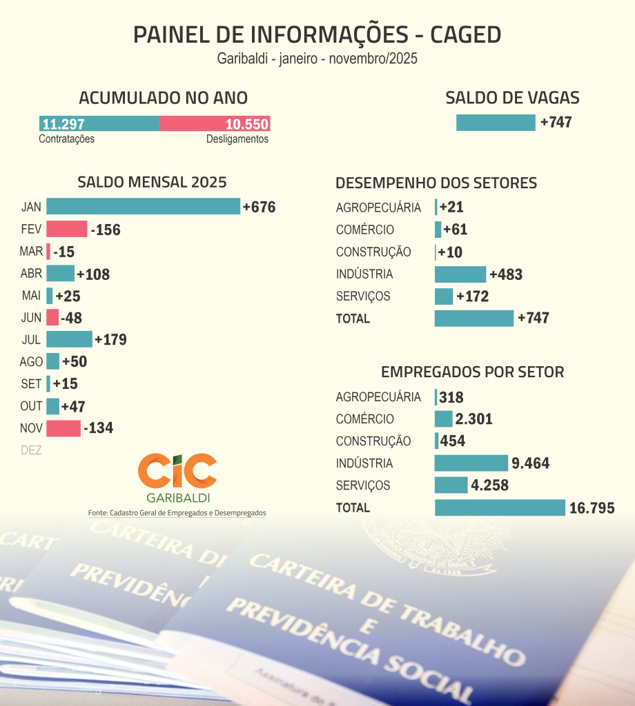 Após quatro meses consecutivos de alta na geração de empregos formais, Garibaldi registrou, em novembro de 2025, uma variação negativa de 134 postos de trabalho com carteira assinada.