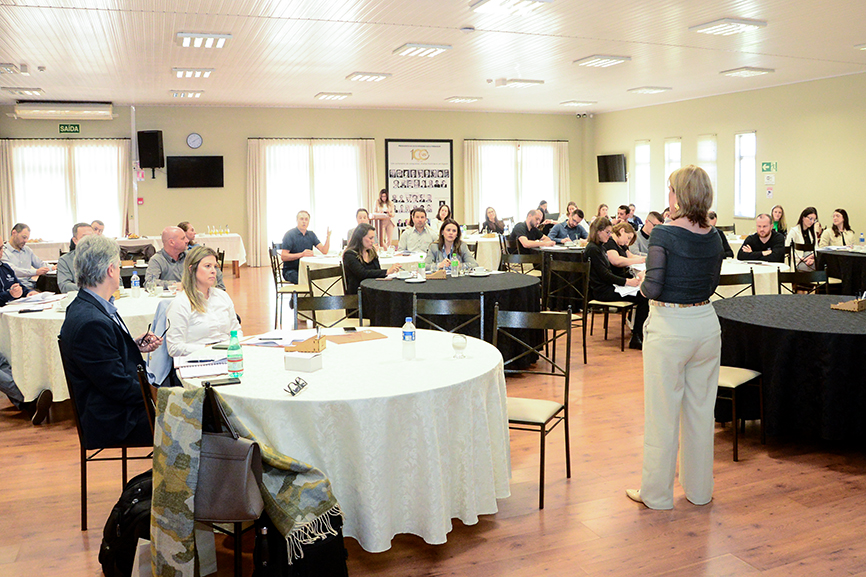 O encontro foi conduzido por Mirieli Colombo, especialista em comunicação e desenvolvimento de líderes, que trouxe uma imersão prática sobre o impacto da linguagem — verbal e não verbal — na construção de vínculos, engajamento e confiança dentro das organizações.