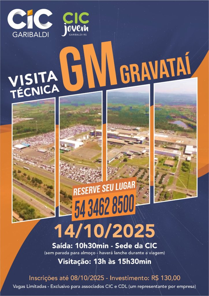 A CIC Garibaldi, em parceria com a CIC Jovem, está promovendo uma visita técnica à fábrica da General Motors (GM) em Gravataí, um dos principais polos industriais do Rio Grande do Sul. A iniciativa será realizada no dia 14 de outubro, proporcionando aos participantes a oportunidade de conhecer de perto a estrutura, os processos produtivos […]