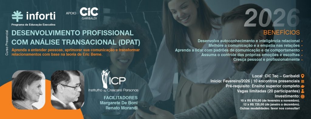 A CIC Garibaldi, em parceria com a Inforti, abriu as inscrições para o Programa de Desenvolvimento Profissional com Análise Transacional (DPAT), entre fevereiro e novembro de 2026, em um total de dez encontros (manhã e tarde). A formação será realizada no CIC-TEC, conduzida pelos especialistas Margarete De Boni e Renato Morandi, do Instithuto dy Crescere […]